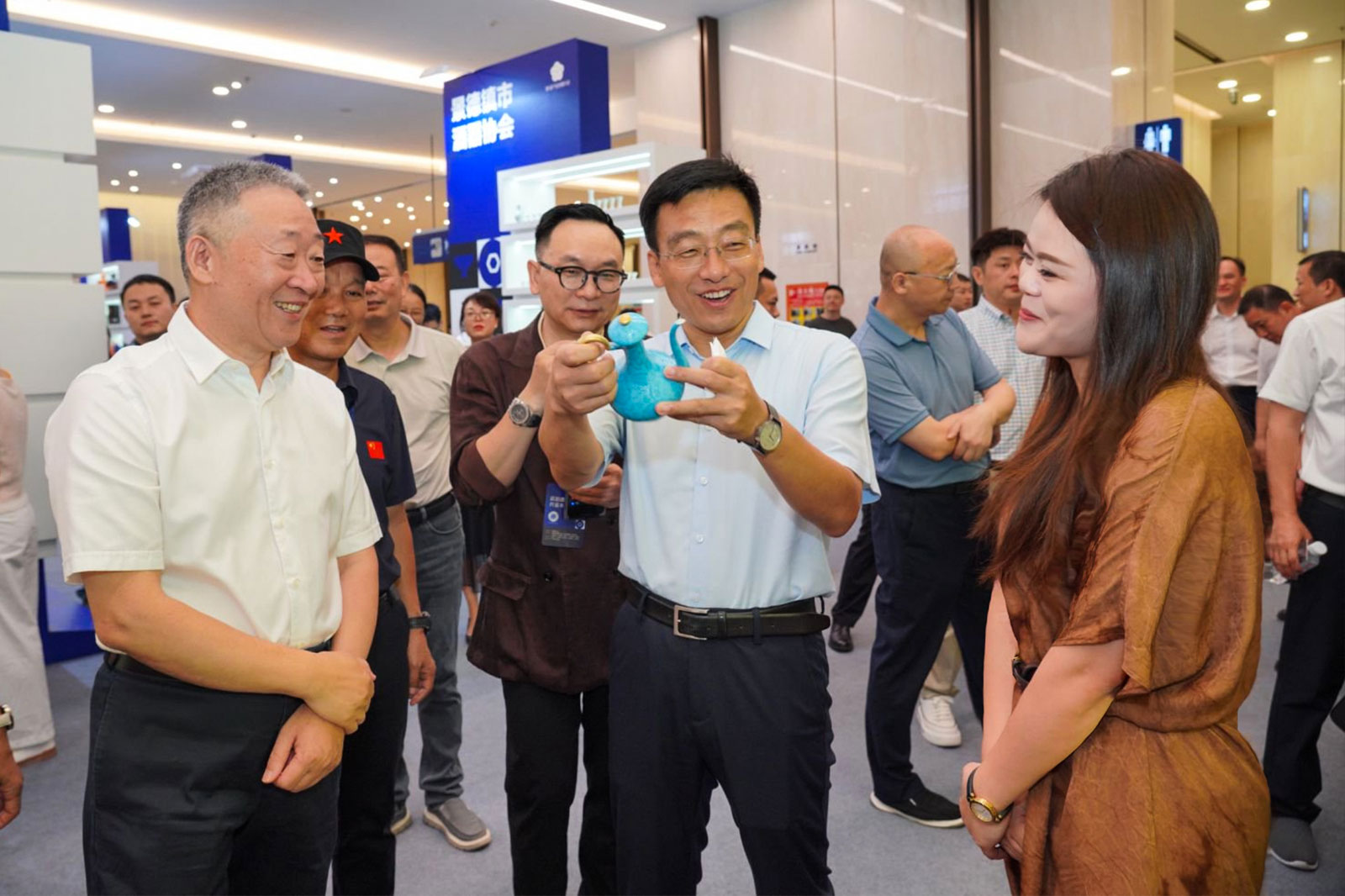 (宋书玉理事长,陈克龙市长莅临辰天展位,鉴赏“流光”酒具)